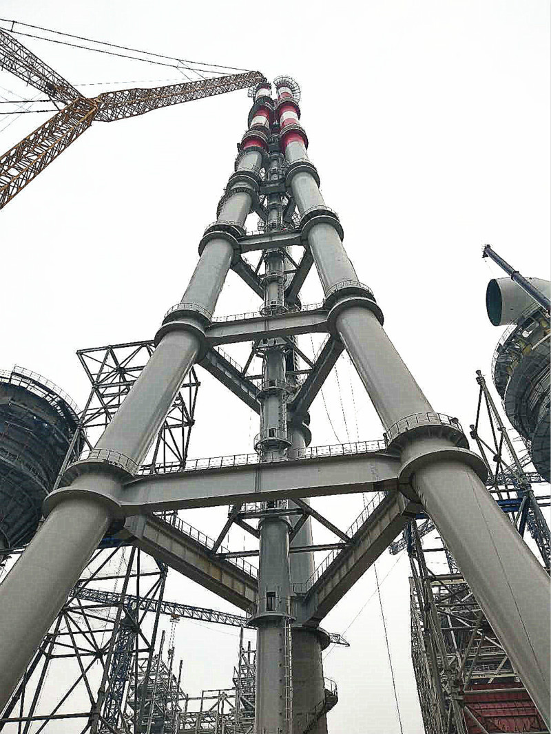 項目配套的三管自立式鋼煙囪,是國能中電引進日本三菱多管自立煙囪技術(shù),并整合了日本鈦板貼襯技術(shù)建設(shè)而成,煙囪內(nèi)徑4.5米,高度180米,分7層,總重2108t。三管自立式鋼煙囪結(jié)構(gòu)合理、造型美觀。三根鋼管煙囪按正三角形布置,通過三角形鋼梁進行剛性連接,形成集束式穩(wěn)定結(jié)構(gòu),每個煙囪由多個直段拼接成流線型曲線。通過整體空間結(jié)構(gòu)來共同抵抗地震荷載、風(fēng)荷載及其它荷載,整個煙囪結(jié)構(gòu)形體規(guī)則,各向受力均勻,造型簡潔、美觀,全面融入了現(xiàn)代氣息和建筑美學(xué)的設(shè)計理念。自2018年8月12日開始施工建設(shè),采用SCC9000/900噸履帶式起重機分七段進行吊裝,在參建各方的共同努力下,歷時135天,于2018年12月25日順利吊裝到頂。